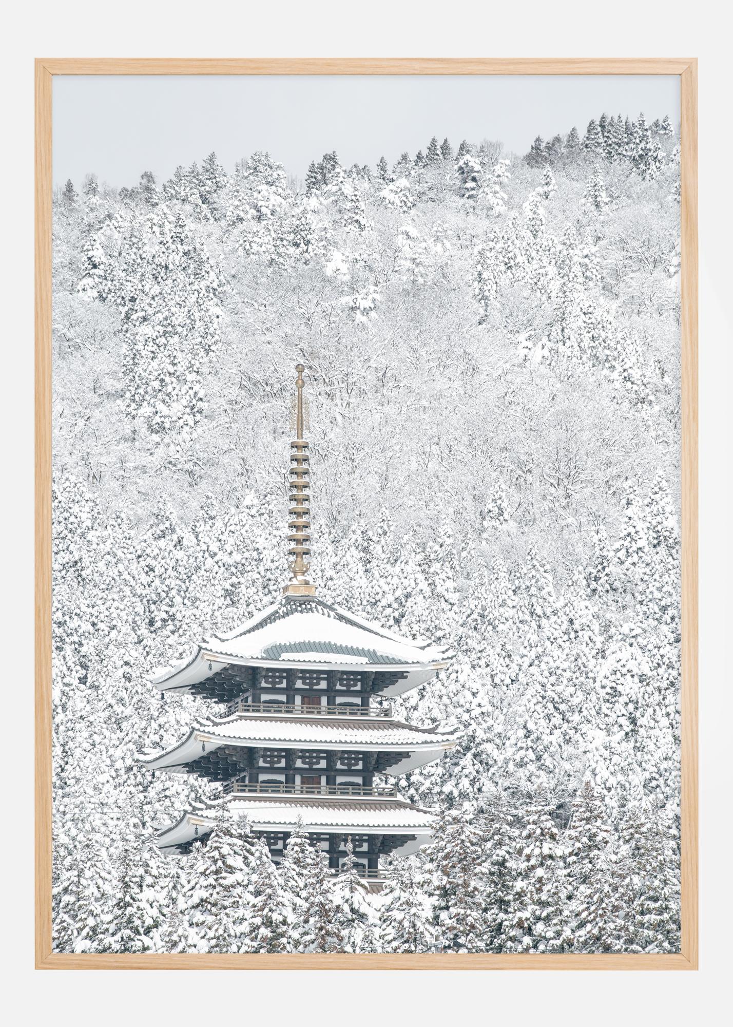 Tämä tunnelmallinen juliste herättää talviasuun pukeutuneen maiseman rauhallisen tunnelman, jossa perinteinen itäaasialainen pagoda seisoo majesteettisesti lumisten puiden meren ympäröimänä. Hienovarainen kontrasti herkän arkkitehtuurin ja voimakkaiden, vehreiden puiden välillä, jotka kaikki on kiedottu paksuun lumikerrokseen, luo kuvan hiljaisuudesta ja eristyneisyydestä. Tämä kuvataulu vangitsee täydellisesti talviluonnon yksinäisen kauneuden, missä valkoisen sävyt vaihtelevat voimakkaasta, säteilevästä valosta pehmeisiin, hillittyihin sävyihin.