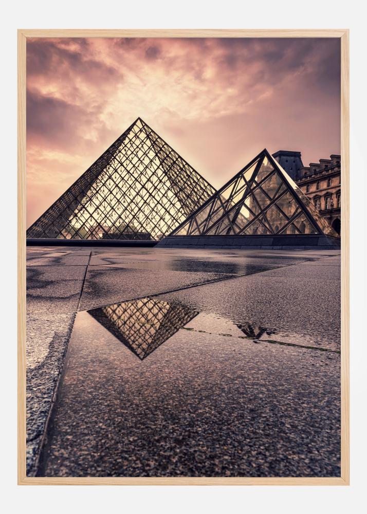 Tämä moderni juliste kuvaa ikonisia geometrisia muotoja kuuluisasta rakenteesta, joka heijastuu vesilätäkössä. Metallisena hohtavat kolmiot ja lasipaneelit on vangittu rohkeaan perspektiiviin, taivaalla, joka on maalattu pehmeillä lilan ja vaaleanpunaisilla sävyillä, iltahämärän viimeisen valon kera. Väripaletti ulottuu viileistä harmaista ja hopeansävyistä lämpimiin kuparisävyihin, mikä heijastaa sekä rakenteen kestävyyttä että taivaan katoavaa kauneutta.