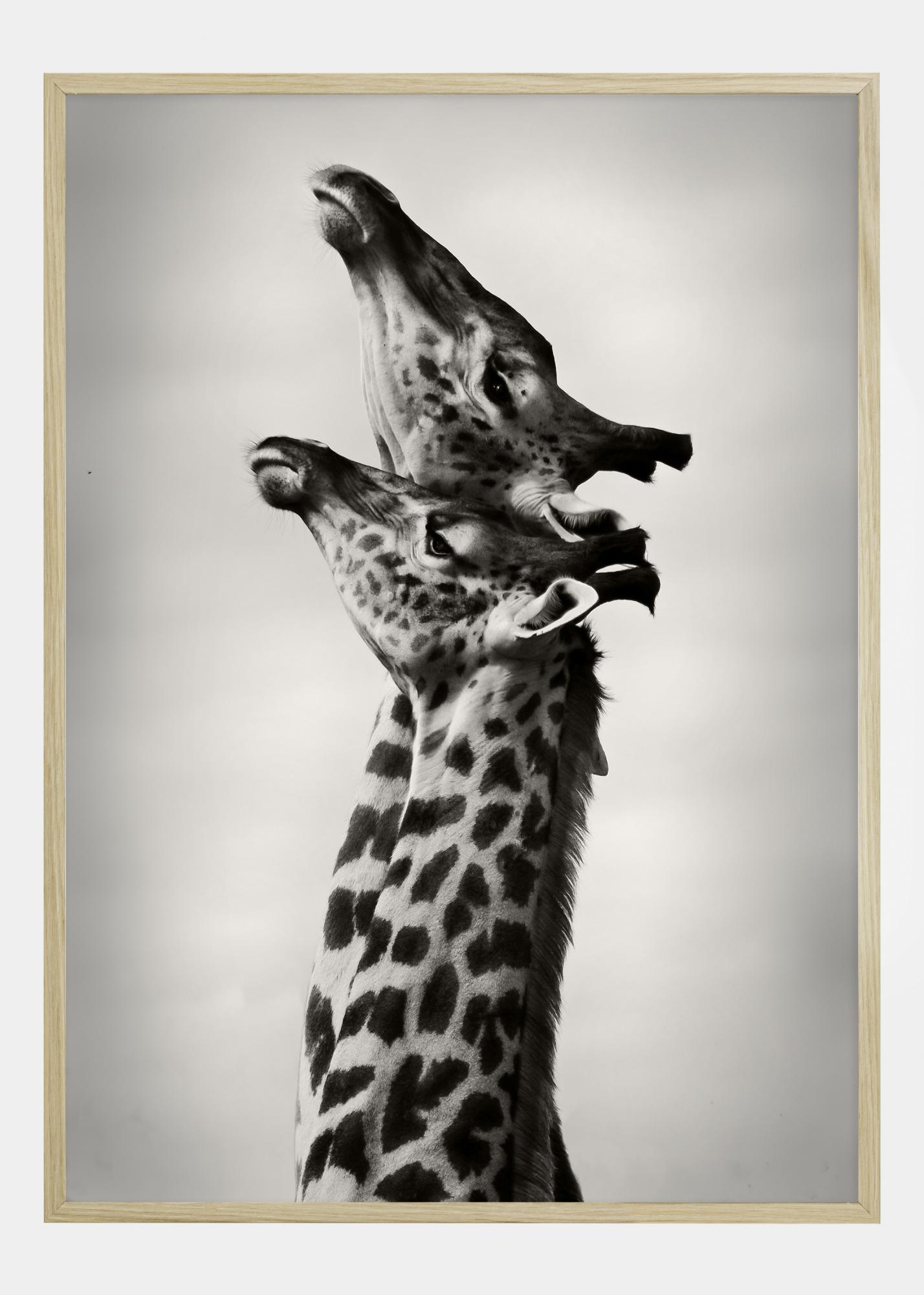Julisteet näyttävät hurmaavan hetken kahden kirahvin välillä, jotka vaikuttavat jakavan hellän vuorovaikutuksen, kaulansa tyylikkäästi toisiaan kohti taipuneina. Kuva on otettu mustavalkoisena, mikä korostaa kirahvien ihon ikonisia kuvioita ja luo vahvan visuaalisen kontrastin pehmeää taivastausta vasten.