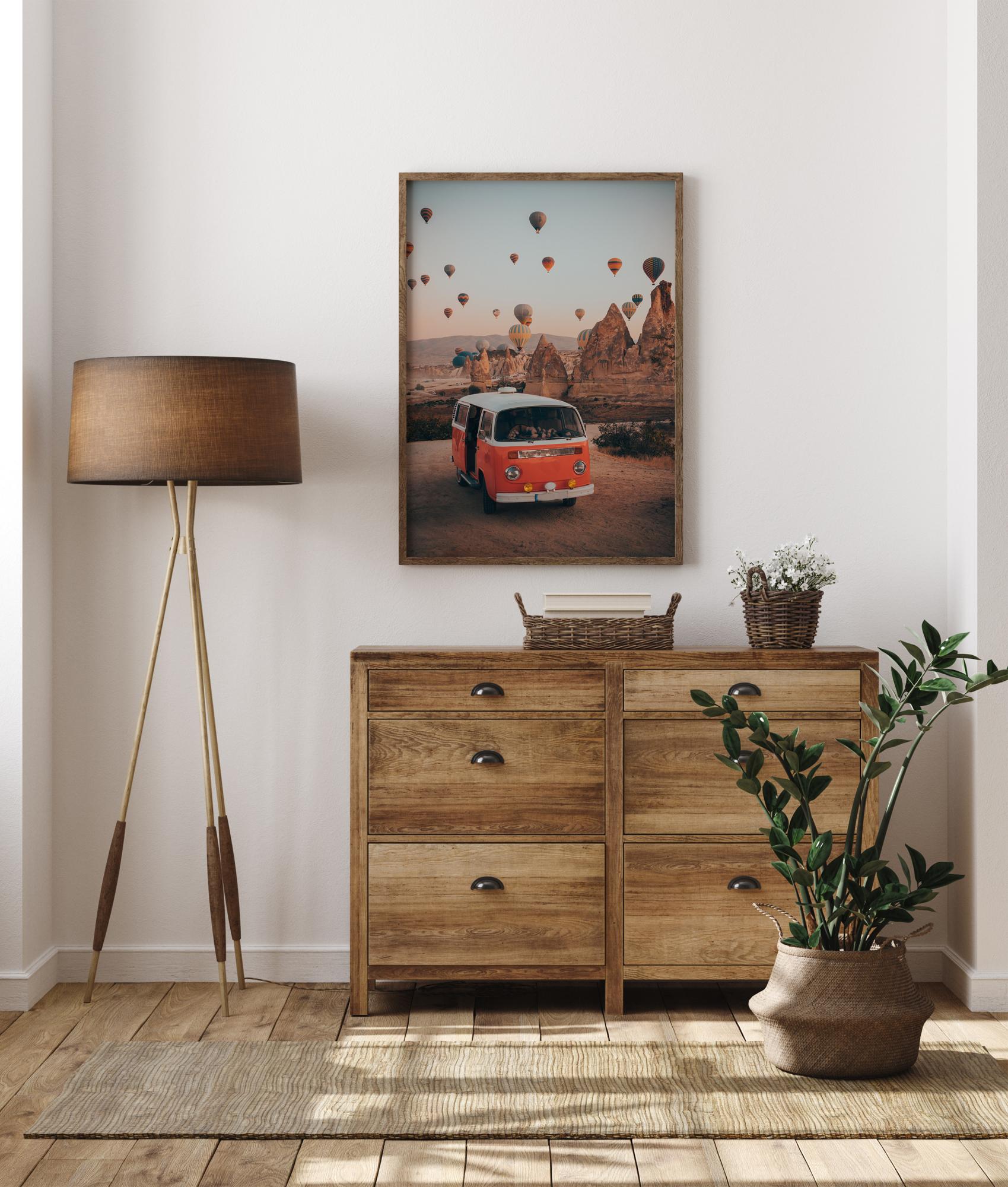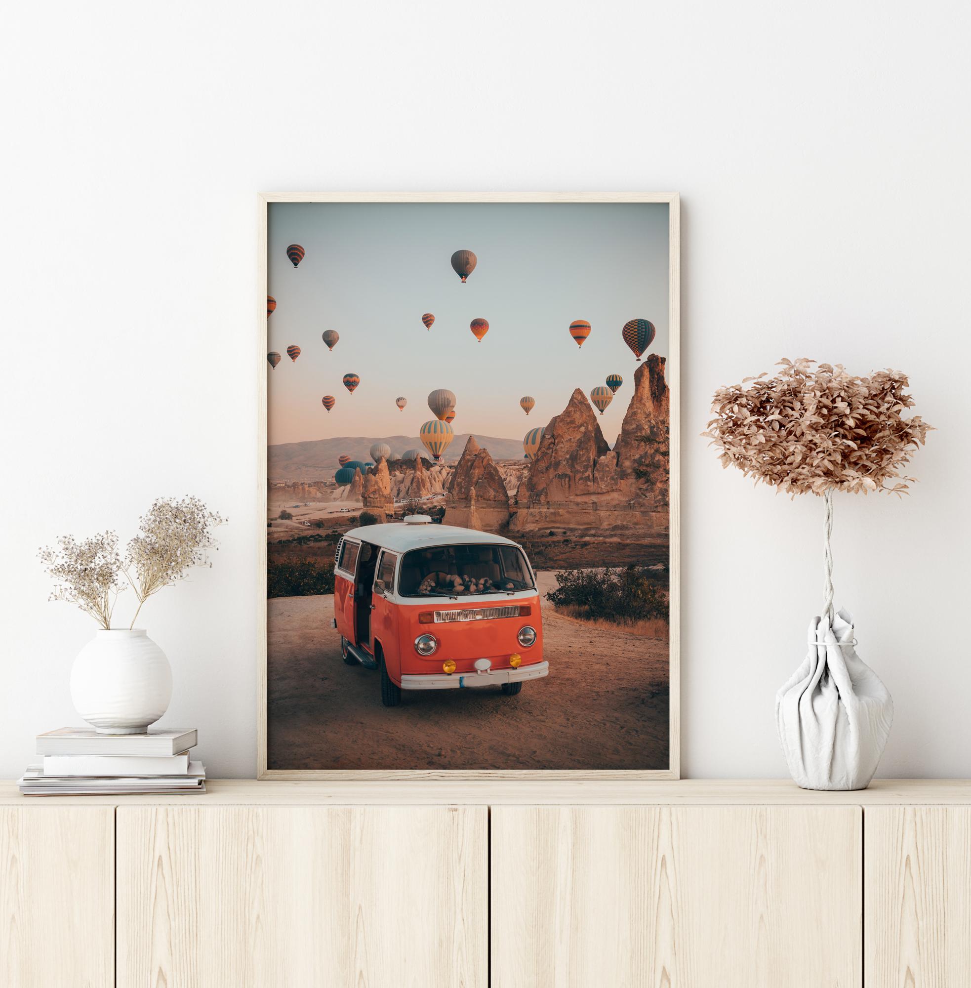 Maisema juliste mielenkiintoisista kalliomuodostelmista, joiden yläpuolella lentää kuumailmapalloja. Etualalla on oranssi Volkswagen-pakettiauto, jonka ovi on auki. Värikkäät ilmapallot täyttävät taivaan takana, kun ne nousevat vaaleansiniselle taivaalle taianomaiselle matkalle.