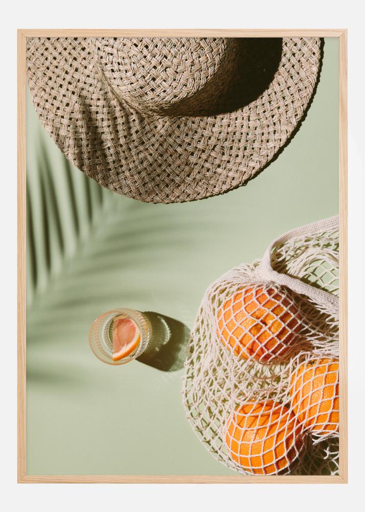 Tämä ihanan kesäinen juliste vangitsee lomatunnelman olemuksen rennolla ja raikkaalla kuvastollaan. Punottu aurinkohattu ja verkko täynnä auringon kypsyttämiä appelsiineja rauhoittavan vihreän taustan edessä välittävät heti tunteen laiskoista päivistä auringossa. Kuva herättää välittömän mielikuvan lämpimästä ilmastosta, raikkaista hedelmistä ja rentoutumisesta. Se on erinomainen valinta kaikille, jotka haluavat tuoda kotiinsa tai työpaikalleen hieman sitä ihanaa lomatunnelmaa.