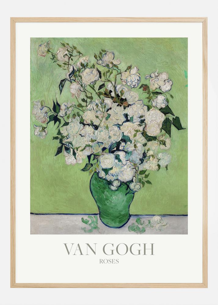 Tämä valoisa ja elinvoimainen juliste esittelee Vincent van Goghin "Ruusut", maalauksen, joka kuvaa hurmaavia ruusuja vahvan vihreässä maljakossa. Van Goghin tunnusomainen tyyli, jossa on paksuja, ekspressiivisiä siveltimenvetoja ja eläviä värejä, korostaa kukkien herkkää kauneutta vastakohtaisella taustalla. Se on teos, joka säteilee sekä intohimoa että syvää arvostusta luonnon kauneudelle.