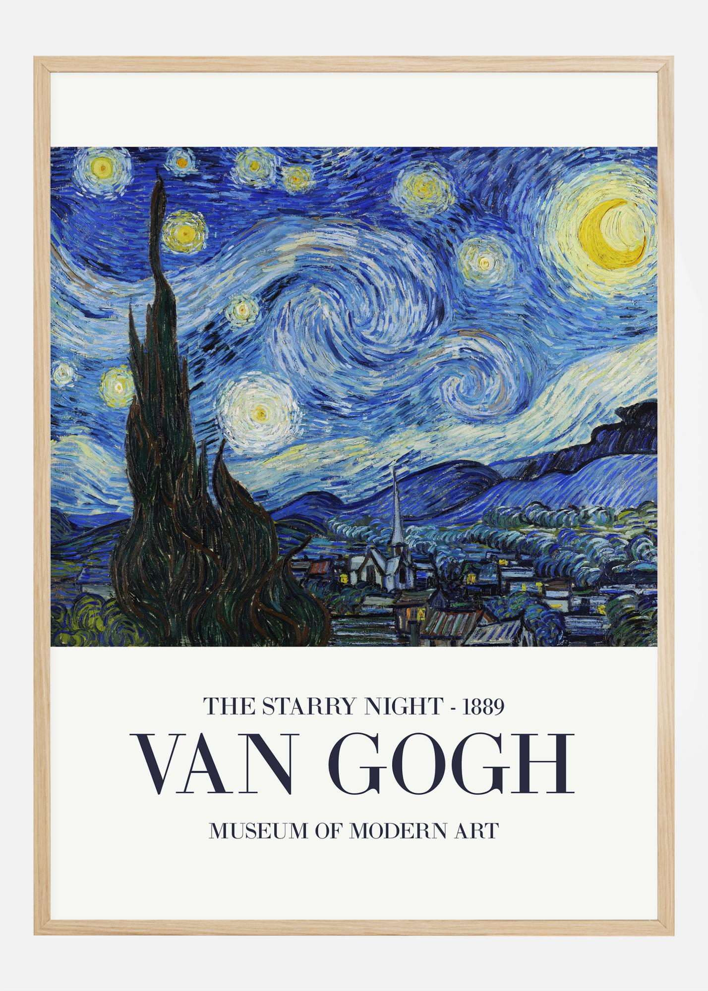 Tämä on juliste, joka kuvaa Vincent van Goghin ajattomat mestariteoksen "Tähtikirkas yö", joka luotiin vuonna 1889. Teos on tunnettu dynaamisesta ja emotionaalisesta esityksestään tähtikirkkaasta yöstä pienen Saint-Rémyn kylän yllä. Sinisellä ja keltaisella pyörteinen taivas sekä ominainen sypressi, joka ulottuu kohti yötaivasta, vangitsevat van Goghin liikkeen tunteen, joka on edelleen vaikuttava yli vuosisata myöhemmin.