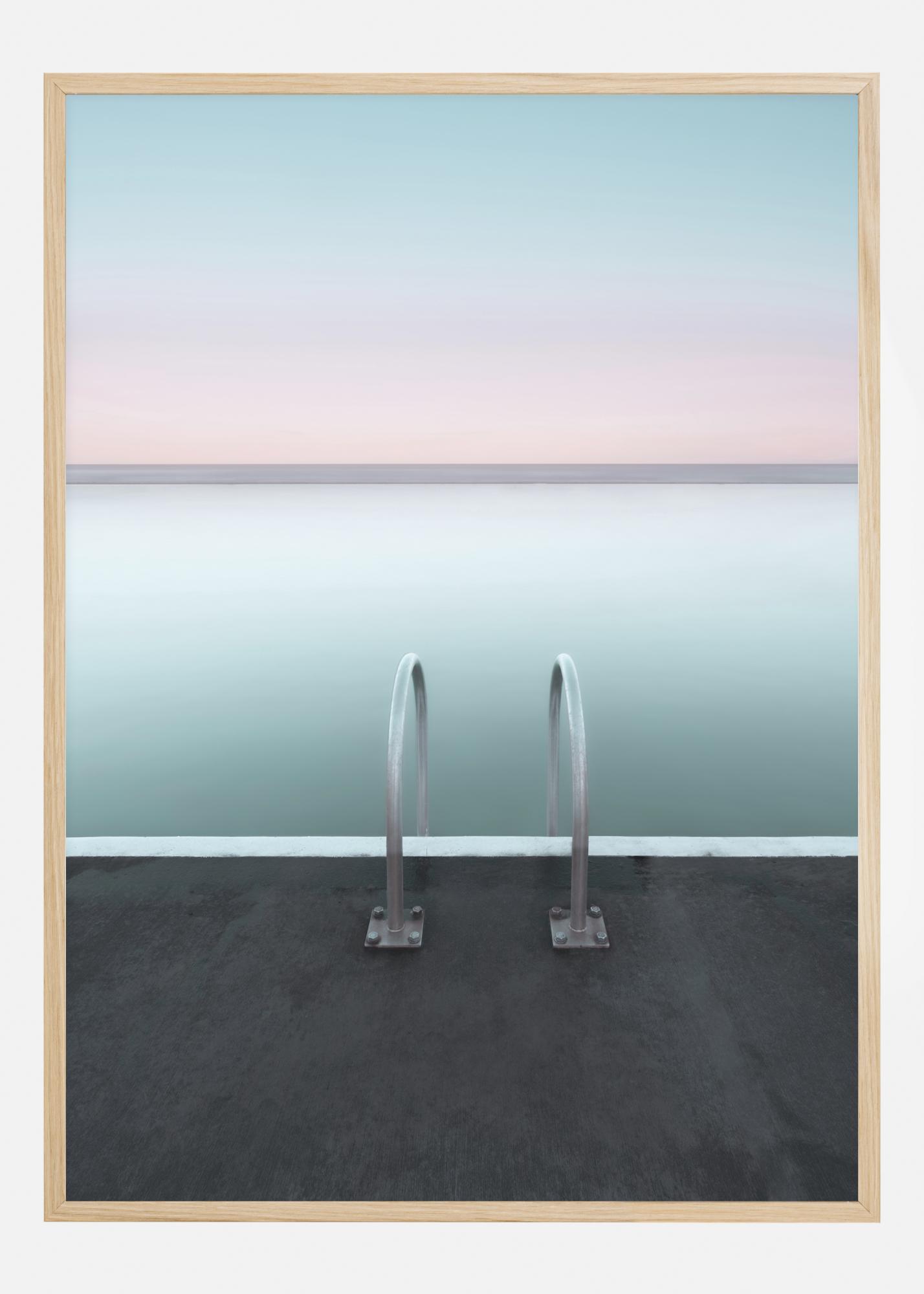 Pastellinvärinen juliste uima-altaan tikapuiden kahvoista, jotka johtavat laiturin reunan yli valtavaan siniseen mereen. Kahvat ovat houkuttelevia, ja ne houkuttelevat seuraamaan niitä reunan yli avaraan siniseen veteen. Taustalla näkyy pehmeä vaaleanpunainen taivas, kun aamuvarhaisen valo on saapunut.
