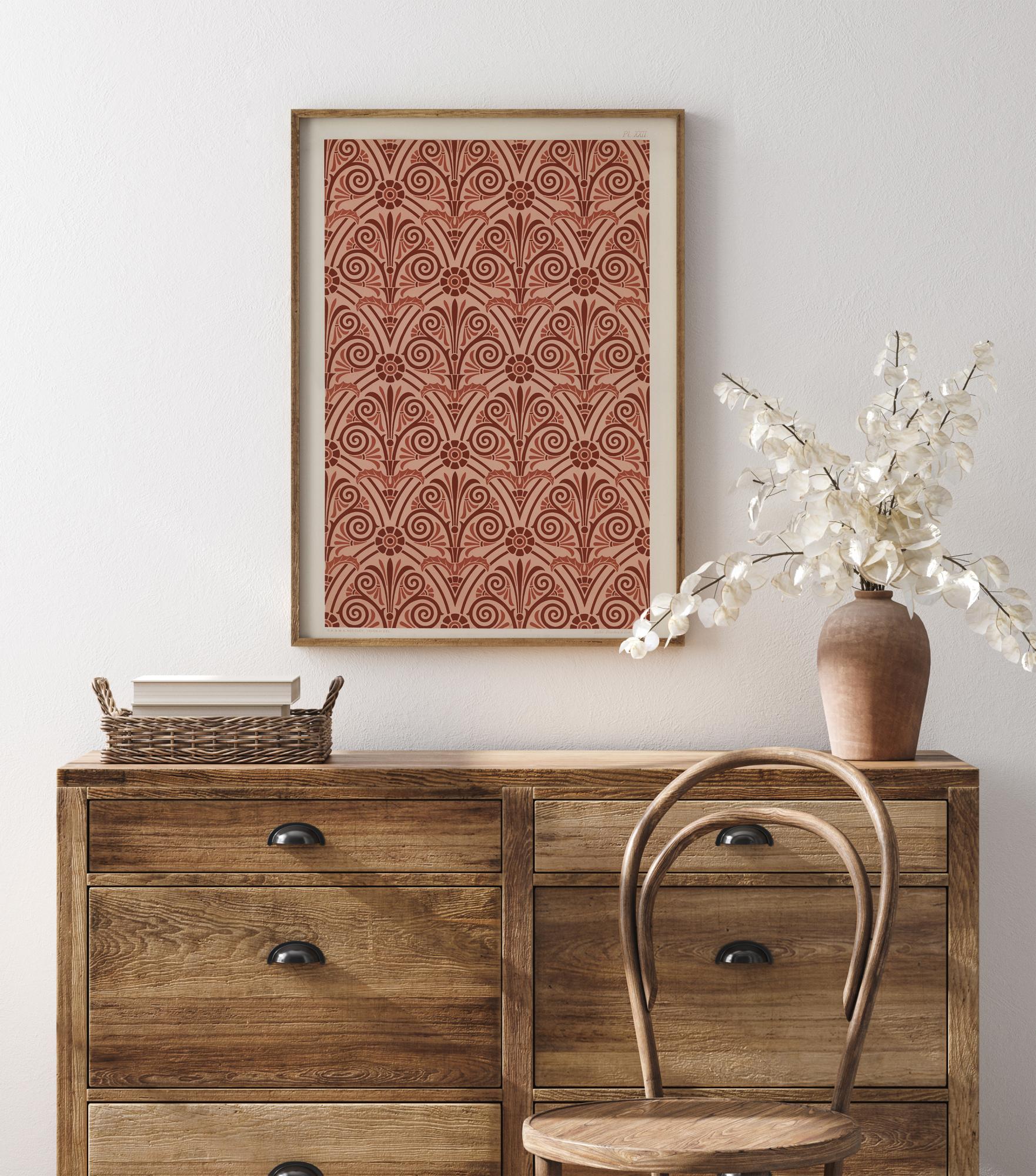 Kirkas, punaisia toistuvia kuvioita sisältävä juliste. Kuvioiden sisällä on kaarevia ympyröitä, jotka näyttävät lehdiltä. Kuvassa on myös kukkien muotoja, mikä tekee tästä kasvitieteellisen painokuvion. Täydellinen tapettiin; katso mitä kuvia näet näissä monimutkaisissa kuvioissa.