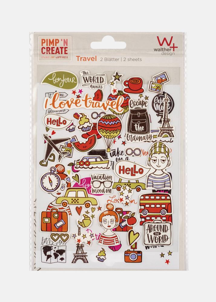 Itsekiinnittyviä tarroja matkateemalla. Täydellinen valokuva-albumien luovaan suunnitteluun, lahjojen koristeluun tai onnittelukorttien luomiseen. Pakkaus sisältää 1 arkin 3D-tarroja ja 1 arkin tasaisia tarroja.