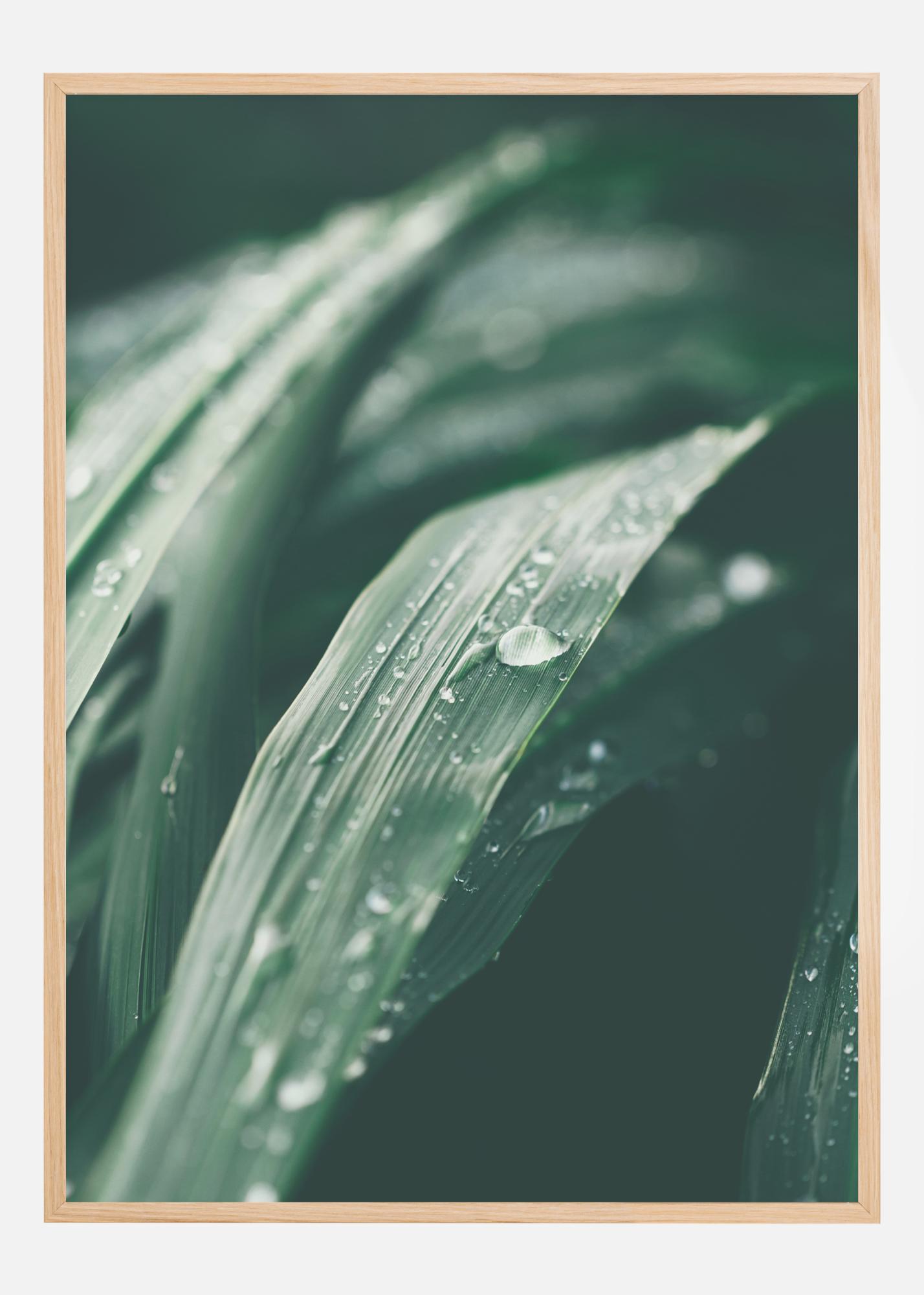 Makrojuliste lehdistä, joissa on vesipisaroita. Tummanvihreät lehdet täyttävät kuvan, ja niiden syyt ovat terävinä yksityiskohtina. Vesipisarat seuraavat lehtien käyriä ja tippuvat alas kohti kuvan reunoja. Lisää tämä pehmeän maanläheisen väriselle seinälle metsäisen tunnelman luomiseksi.