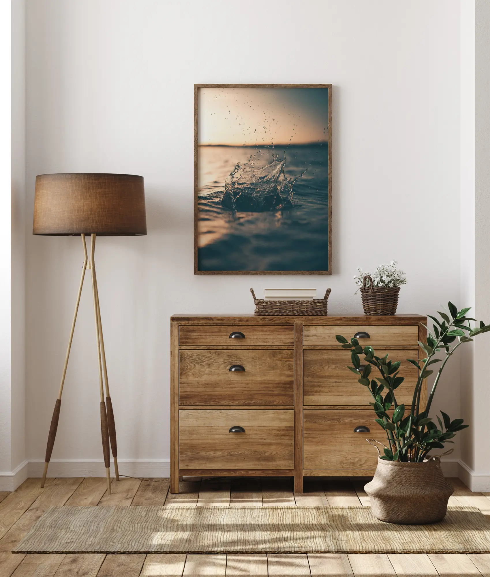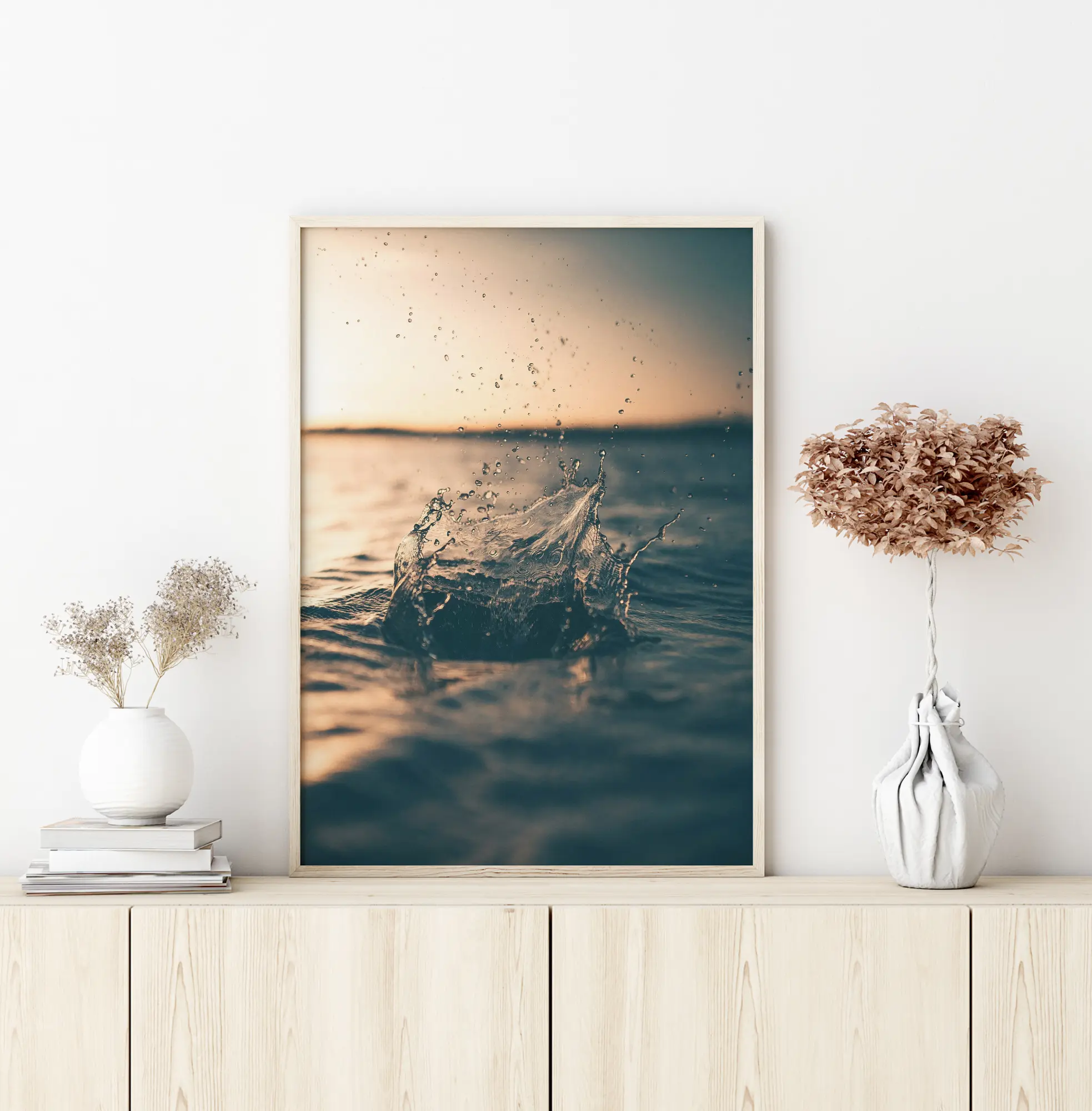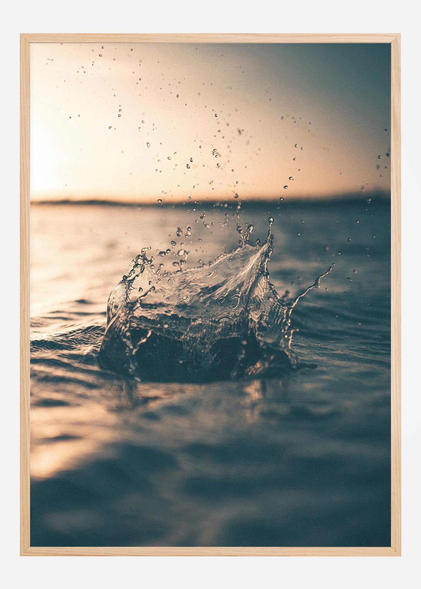 Lähikuvapainatus vesilammikkoon putoavan esineen jälkiroiskeesta. Roiskeen reunat ponnahtavat ylös muodostaen pieniä pisaroita ilmaan. Aurinko paistaa vasemmalta, valaisee tämän kohtauksen ja vangitsee ylös nousevan vesisuihkun. Tämä on lumoava kuva.