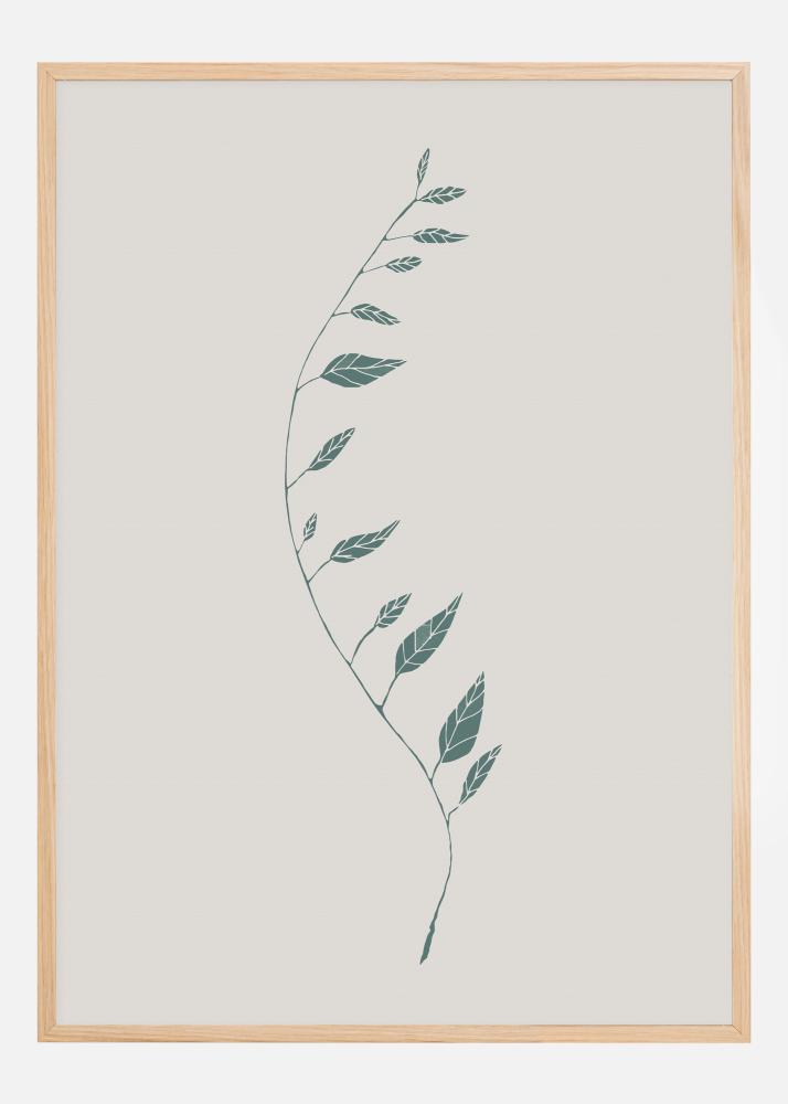 Minimalistinen juliste pitkästä vihreästä oksasta, joka kaartuu pehmeästi valkoisella taustalla. Oksan ohut viiva aaltoilee kevyesti, kaikki lehdet ovat samalla puolella, aivan kuin tuuli puhaltaisi niitä. Sen yksinkertaisuus antaa rauhallisen tunteen, joka sopii erinomaisesti rentouttavaan kylpyhuoneen tunnelmaan.
