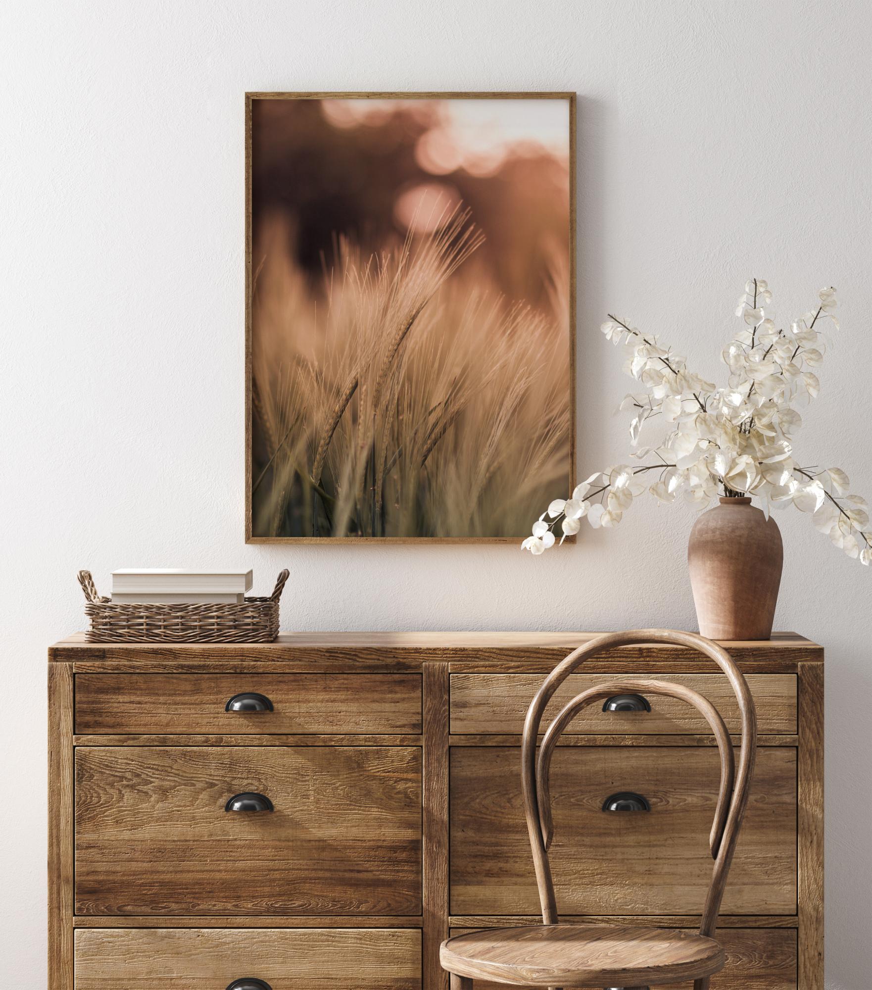 Pehmeä juliste vehnänkorvista myöhäisiltapäivän auringossa. Pehmeä vaaleanpunainen valo häivyttää kultaisia vehnänkorvia luoden pehmeän, lähes maagisen kuvan. Tee arkipäivästä jotain kaunista, kun lisäät tämän julisteen pehmeälle neutraalille seinälle luomaan rauhallisen tunnelman.