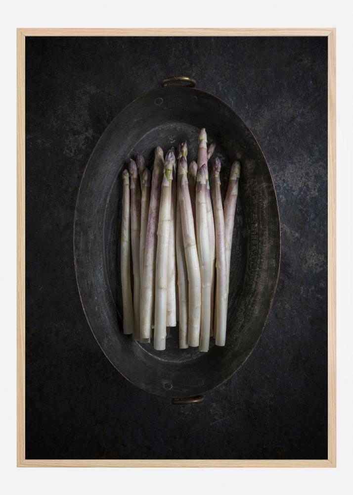Vihannesaiheinen juliste, jossa valkoiset parsat ovat pannulla. Valkoiset parsanvarret erottuvat voimakkaana kontrastina tummasta mustasta pannusta ja pöytälevystä. Lisää tämä hauska kuva keittiöösi, jotta saat inspiraatiota kokkaillessasi.