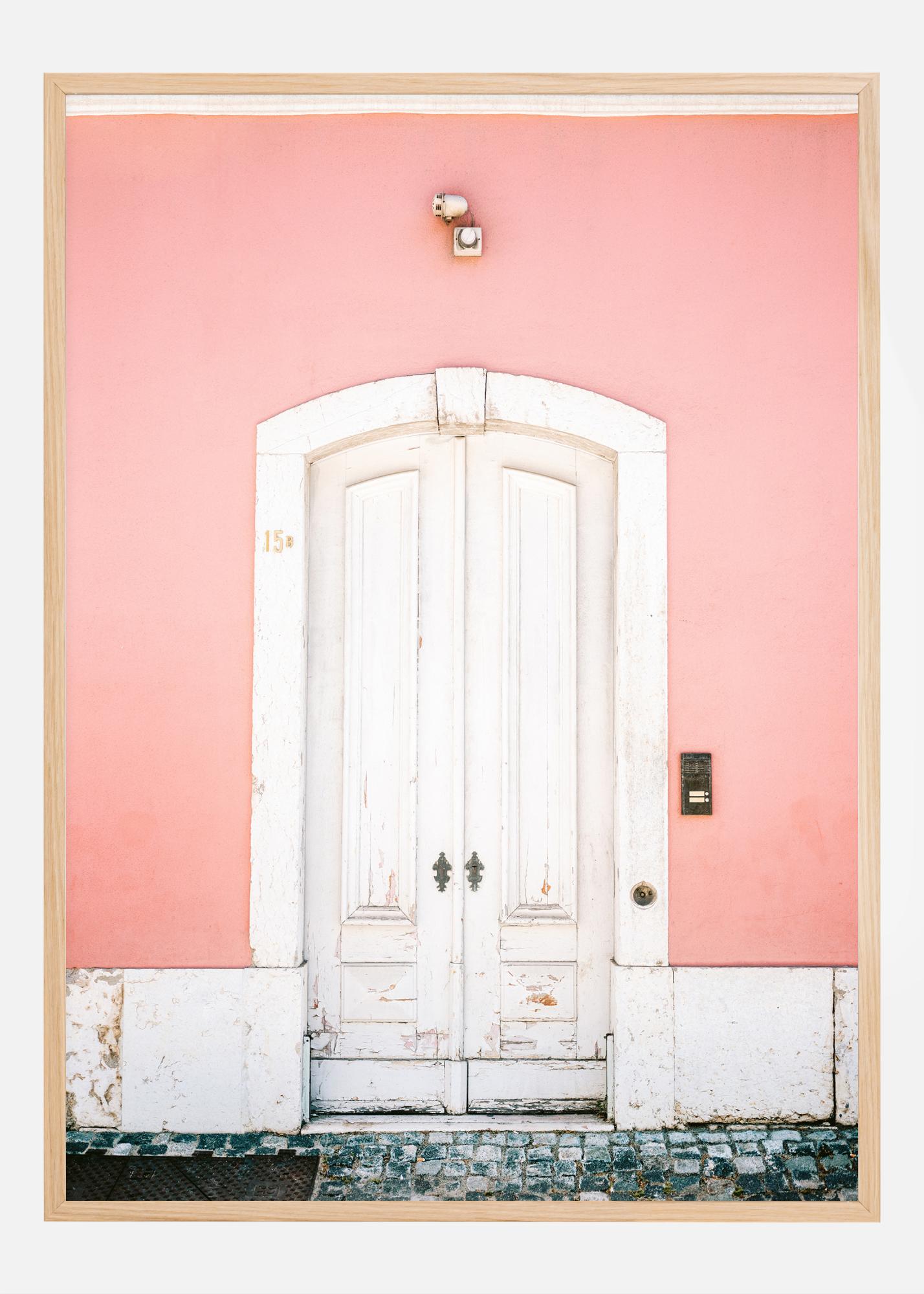 Tämä juliste esittelee kauniin kuvan valkoisesta ovesta pehmeän vaaleanpunaisen seinän edessä, näkymän, joka henkii rentoa ja silti eleganttia tyyliä, joka on niin tyypillistä Lissabonille. Oven valkoiseksi maalattu pinta, joka osoittaa jälkiä patinasta ja iästä, luo tunteen historiasta ja luonteesta, kun taas mustat rautayksityiskohdat antavat klassisen vivahteen. Talon numero "15" on huomaamattomasti sijoitettu oven vasemmalle puolelle, ja kivetty jalkakäytävä vahvistaa eurooppalaisen kaupunkikuvan viehätysvoimaa.