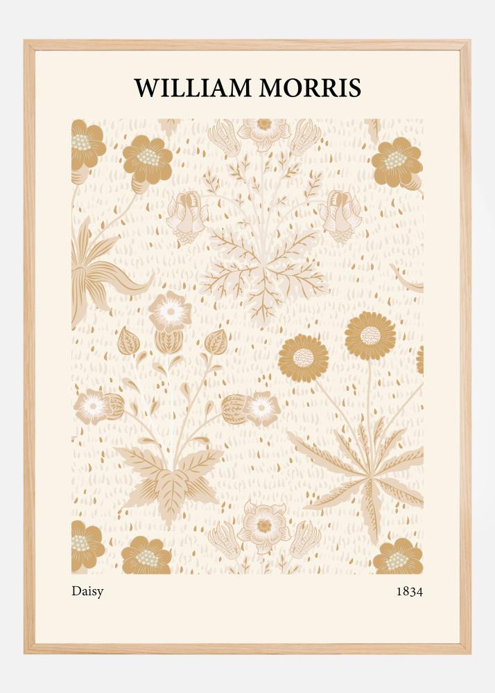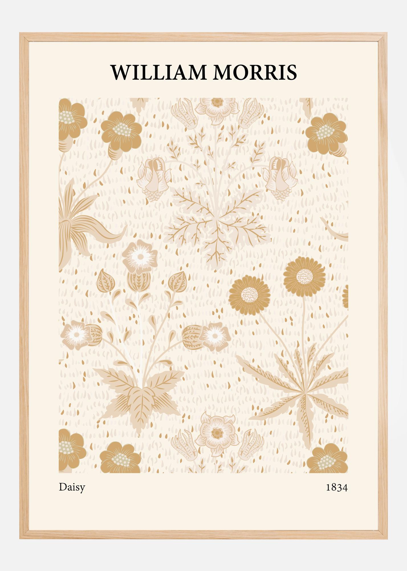 Tämä herkkä ja tyylikäs juliste kuvaa klassista William Morris -suunnittelua, joka tunnetaan ajattomasta estetiikastaan ja sijainnistaan taidehistoriassa. Kuvio koostuu harmonisesta kokoelmasta kukkia ja kasvillisuutta, esitettynä pehmeässä ja luonnollisessa väripaletissa. Suunnittelu korostaa Morrisin rakkautta luontoon yksityiskohtaisilla kuvauksilla päivänkakkaroista, lemmikeistä ja muista kasviaineksista, joiden sijoittelu paperille luo rauhallisen ja tasapainoisen vaikutelman. Väreinä hallitsevat sävyt ovat beige, kermanvalkoinen ja erilaiset ruskean sävyt, jotka yhdessä tuovat lämpimän ja kutsuvan tunteen mihin tahansa huoneeseen.