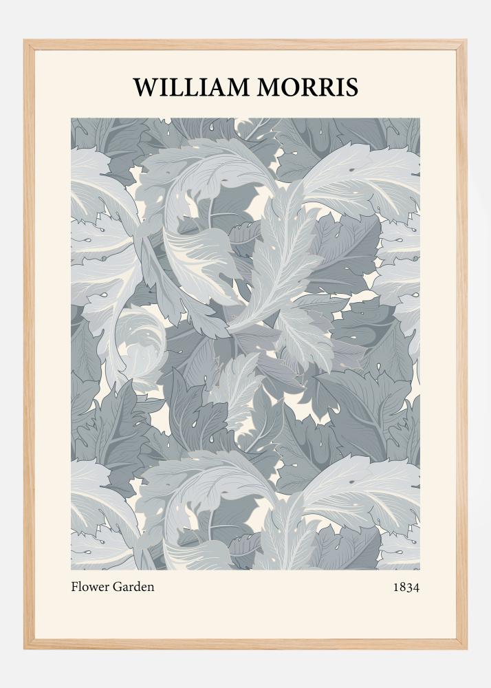 Tämä juliste sen vehreällä ja hienostuneella William Morris -aiheella tarjoaa sekä rauhallisuuden että klassisen eleganssin tunteen. Muotoilu on ylistyslaulu runsaalle vihreydelle, joka usein liitetään Morrisiin ja hänen työhönsä Arts and Crafts -liikkeessä. Aihe, nimeltään "Kukkatarha", sisältää tiiviin lehvistön ja kukintojen sommittelun, esitettynä viileissä sinisen ja harmaan sävyissä, joissa on ripaus kermanvalkoista. Tämän julisteen jokainen yksityiskohta on tarkkaan harkittu, luoden tunteen hyveellisestä ja järjestäytyneestä puutarhasta.