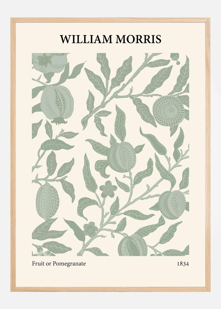 Tämä erottuva William Morris -juliste, nimeltään "Fruit tai Pomegranate", vangitsee katsojan huomion tarkkaan järjestetyllä hedelmä- ja lehtikuviollaan. Taideteos vaikuttaa sekä virkistävältä että ajattomalta, rauhoittavilla vihreillä sävyillään pehmeällä kermanvärisellä taustalla. Granaattiomenoiden ainutlaatuinen muoto ja rakenne korostuvat kontrastin luovilla tummemmilla vihreillä lehdillä, mikä luo miellyttävän rytmin ja visuaalisen syvyyden suunnitteluun. Tämä on juliste, jolla on vahva yhteys luontoon ja sen rikkaaseen kauneuteen.