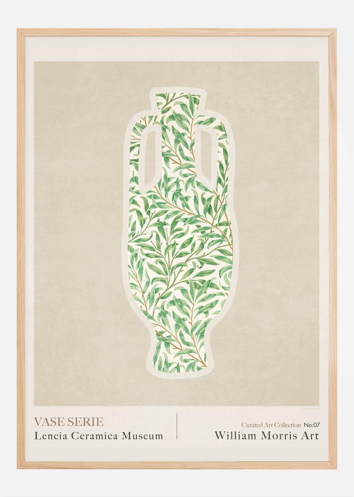 Tämä herkkä ja luonnosta inspiroitunut juliste on numero 07 "Curated Art Collection" -sarjassamme Lencia Ceramica Museosta, joka juhlistaa William Morrisin taiteellista perintöä. Se esittää klassisen vaasin siluetin, joka on täytetty yhdellä Morrisin tunnistettavista vihreistä kasvikuvioista, mikä osoittaa hänen mestarillisen kykynsä yhdistää muoto ja toiminto esteettiseen kauneuteen suunnittelussa. Se on ajaton kunnianosoitus Morrisin visioon ja hänen kykyynsä ottaa inspiraatiota luonnosta ja muuttaa se taiteeksi.