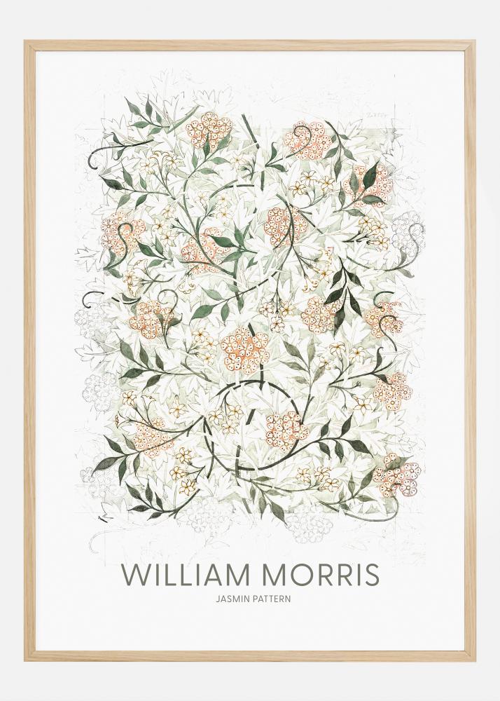 Tämä upea juliste esittelee "Jasmin-kuvion", jälleen yhden ajattoman teoksen kuuluisalta suunnittelijalta William Morrisilta. Kuvio on hurmaava koostumus jasmiininkukista ja lehdistä, valmistettu Morrisille ominaisella taidolla ja tarkkuudella. Värimaailma on pehmeä ja luonnollinen paletti, mikä korostaa kukkien hienovaraisia muotoja ja lehtiä rauhallista taustaa vasten.