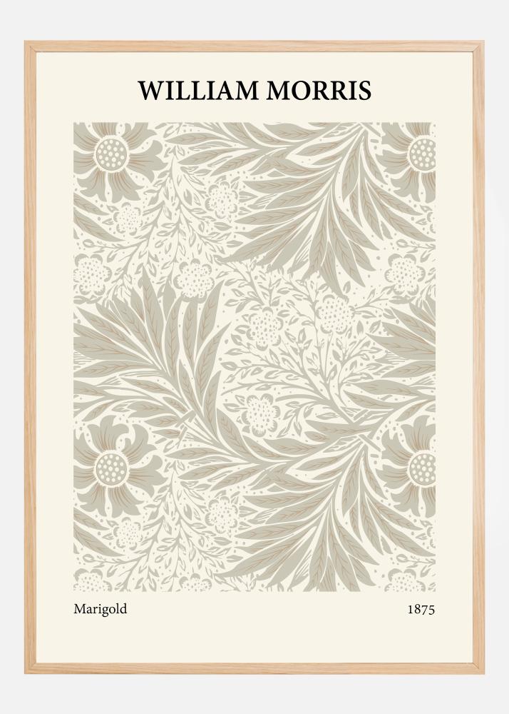 Tämä juliste esittelee William Morrisin ajattoman "Marigold"-kuvion vuodelta 1875. Se on silmiinpistävä esitys Morrisin taitavasta muodon ja luonnosta inspiroituneiden elementtien käytöstä, jotka kietoutuvat yhteen harmoniseksi kuvioksi. Julisteen design on erinomainen esimerkki Arts and Crafts -liikkeen filosofiasta, jossa käsityön ja luonnollisen maailman kauneus korotetaan taiteen muotoon.