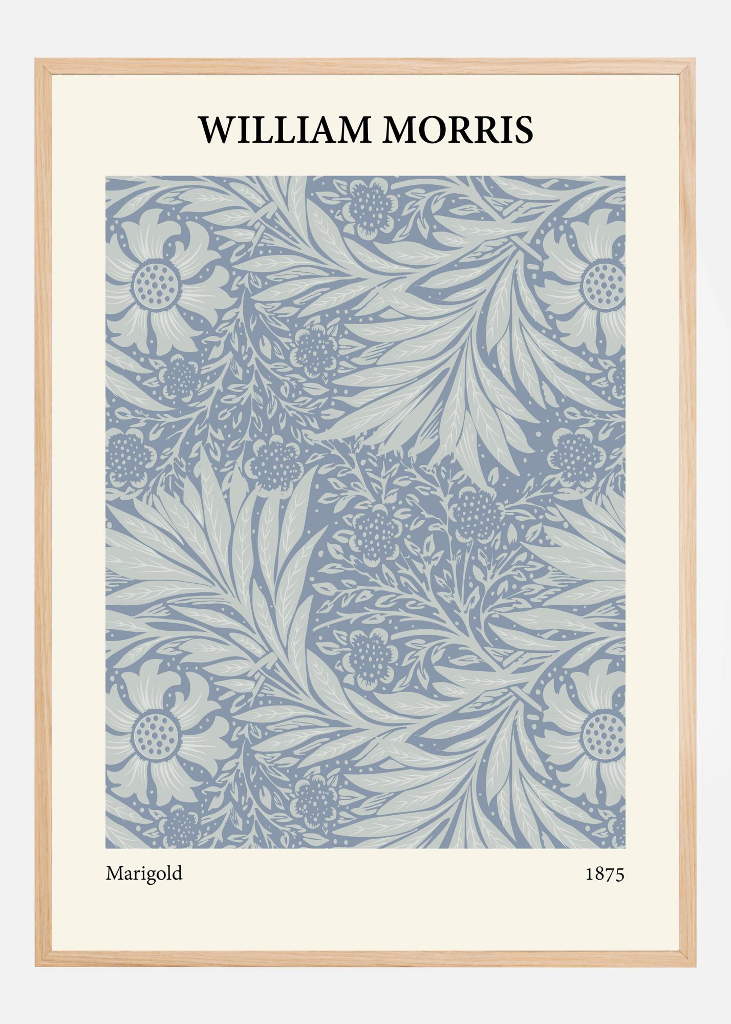Tämä kauniisti muotoiltu William Morrisin juliste esittelee "Marigold"-kuvion vuodelta 1875 kiehtovassa sinisessä väripaletissa. Kuvion yksityiskohtaisuus ja luontoon liittyvä tyyli ovat osoitus Morrisin kyvystä luoda taideteoksia, jotka juhlistavat ja heijastavat luonnon kauneutta. Tämä design edustaa viktoriaanisen aikakauden käsityötaitoa ja Arts and Crafts -liikkeen arvostusta käsintehtyihin esineisiin.