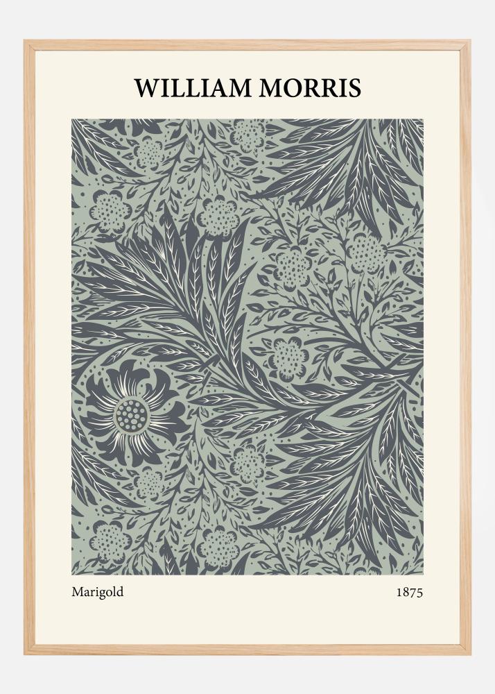 Tämä William Morris-juliste, jossa on sen lumoava "Marigold"-kuvio vuodelta 1875, osoittaa Morrisin ainutlaatuisen kyvyn luoda yksityiskohtaisia ja harmonisia kasvikuvituksia. Aihe on täynnä elämää ja liikettä, sen kiemurtelevine lehtineen ja kukkineen, jotka näyttävät kasvavan esiin itse paperista. Värisävyt, rauhoittavissa vihreän sävyissä ja tummemmissa korostusväreissä, luovat elegantin ja samalla luonnollisen vaikutelman.
