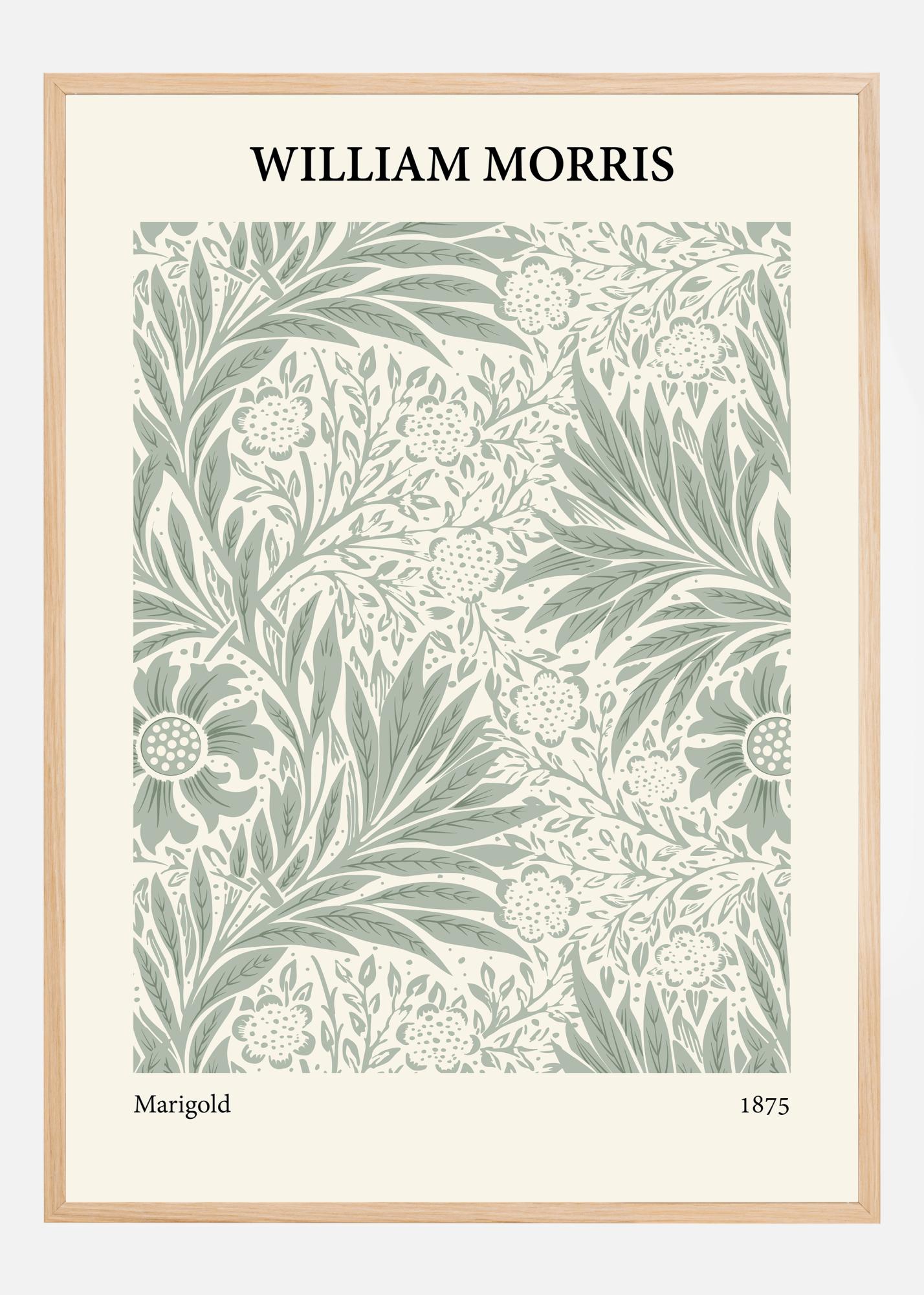 Tämä erottuva juliste esittelee William Morrisin "Marigold" -suunnittelun vuodelta 1875, joka esittää luonnosta inspiroituneita motiiveja, kaikki esitetyinä tunnistettavalla taidolla ja yksityiskohtien huomioinnilla. Elävä mutta samalla hillitty vihreä väripaletti on tyypillistä Morrisille, herättäen henkiin jokaisen lehden ja terälehden, tehden teoksesta ajattoman sisustusklassikon.