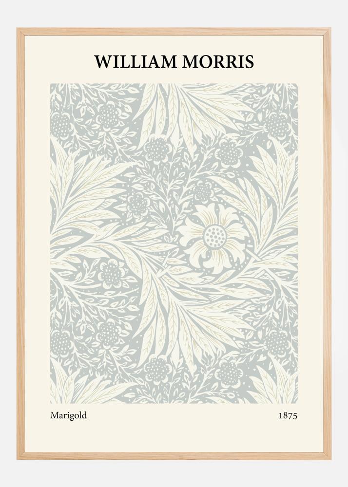 Tämä juliste on tyylikäs tulkinta William Morrisin klassisesta "Marigold" kuviosta vuodelta 1875, esitettynä pehmeässä ja rauhoittavassa väripaletissa. Suunnittelu on symfonia monimutkaisesti kietoutuneista kukista ja lehdistä, jotka yhdessä luovat tunteen tyynestä englantilaisesta puutarhasta. Morrisin rakkaus luontoon ja käsityöhön loistaa läpi jokaisesta tämän monimutkaisen sommitelman yksityiskohdasta.