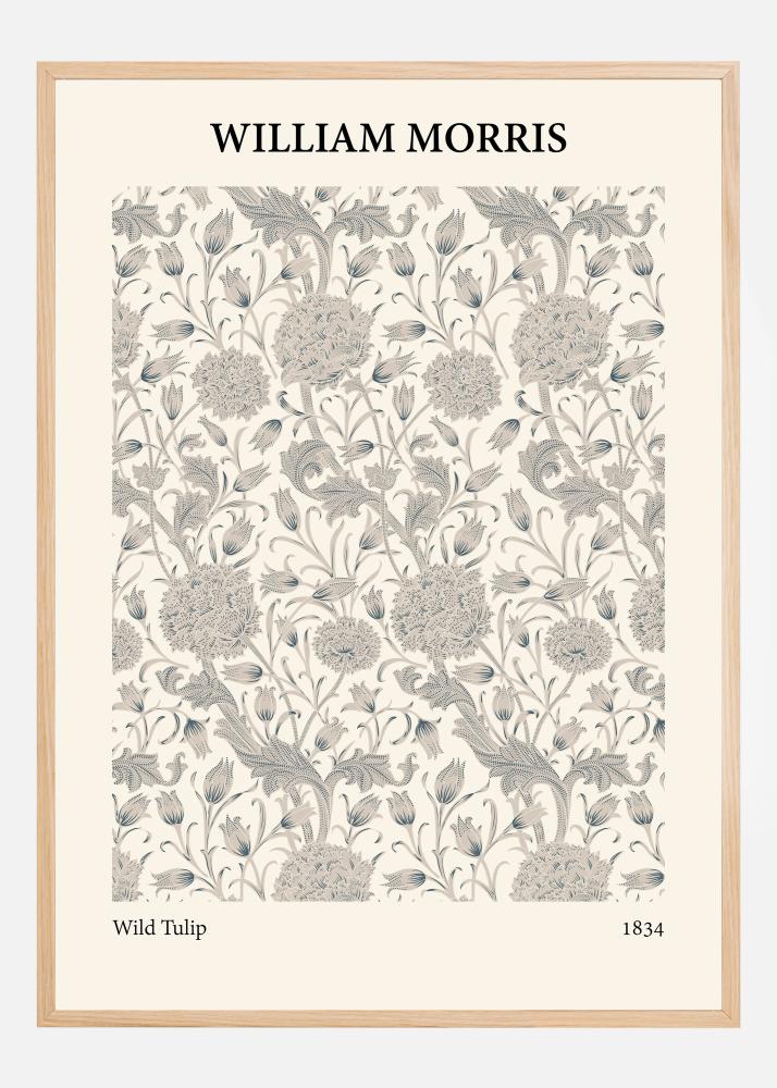 Tämä William Morris -juliste, nimeltään "Wild Tulip", on elegantti tulkinta luonnonkukista, koostettu suurella taidolla ja huolella. Kuvio on tulppaanien ja lehtien sokkelo, toteutettu hienovaraisilla beigen ja harmaan sävyillä lämpimän, kermansävyisen taustan päällä, mikä tekee siitä ihanteellisen teoksen, joka haluaa luoda rentouttavan ja hienostuneen ilmapiirin. Kuvitusten yksityiskohtaisuus osoittaa Morrisin mestarillisen kädenjäljen ja hänen kykynsä muuttaa arkiset näkymät taiteeksi.