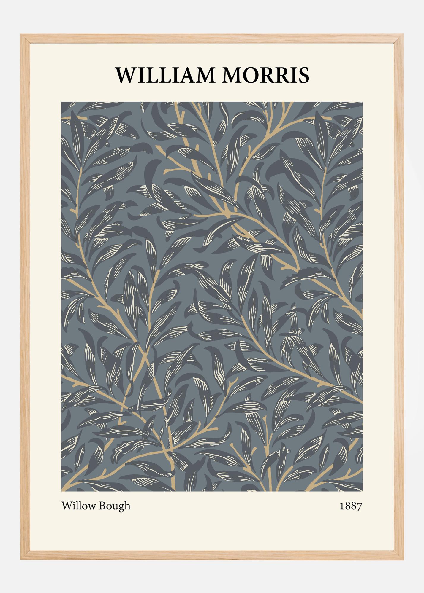 Tämä on huomiota herättävä juliste, joka tuo esiin William Morrisin klassisen "Willow Bough" -kuvion vuodelta 1887. Tyylikkäät pajunlehdet on taitavasti esitetty sinisen ja harmaan sävyissä, jotka on elegantisti kontrastoitu lämpimän kultaisen sävyisillä linjoilla. Tämä yhdistelmä tuo rikkautta ja syvyyttä kokonaisvaltaiseen suunnitteluun ja todistaa Morrisin mestarillisuudesta sekä hänen pysyvästä vaikutuksestaan kuviosuunnittelun alalla.
