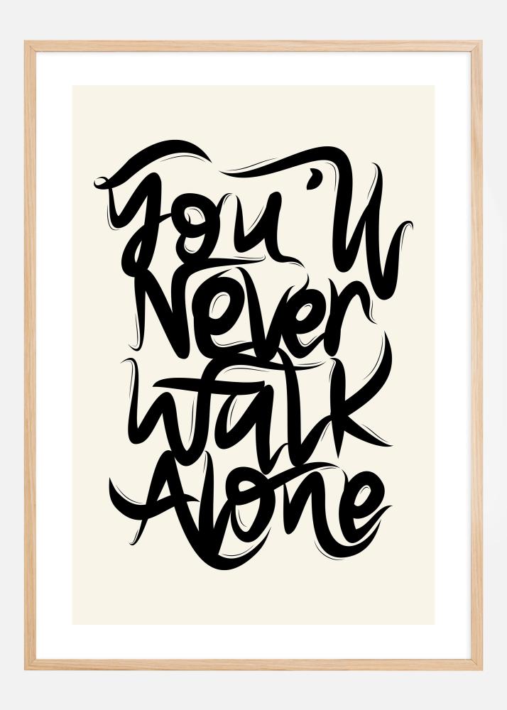 Tämä voimakas juliste esittelee leikkisää ja taiteellista kalligrafiaa lauseesta "You Never Walk Alone" mustalla tekstillä lämpimän, kermanvärisen taustan päällä. Typografian virtaava ja dynaaminen tyyli näyttää sanat lomittain, antaen ilmaisua liikkeelle ja yhteenkuuluvuudelle. Suunnittelu tasapainottaa taitavasti luettavuuden ja taiteellisen vapauden välillä, tehden tekstistä sekä viestinkantajan että itsessään esteettisen objektin.