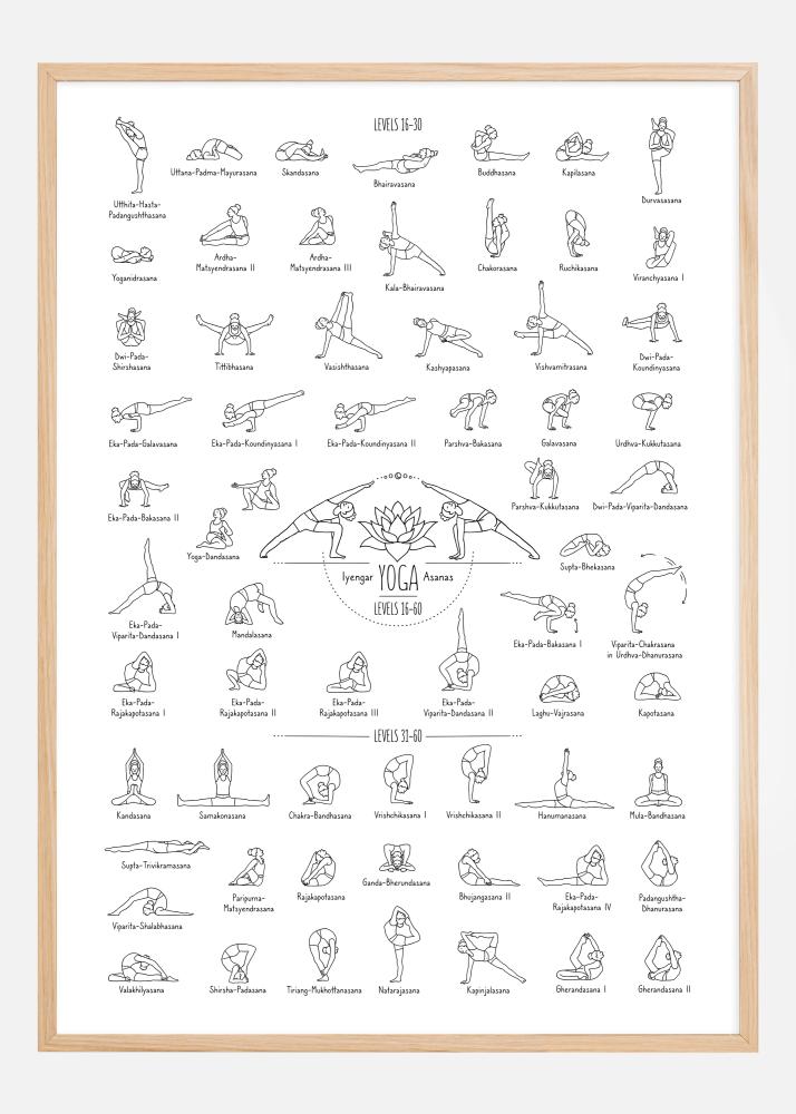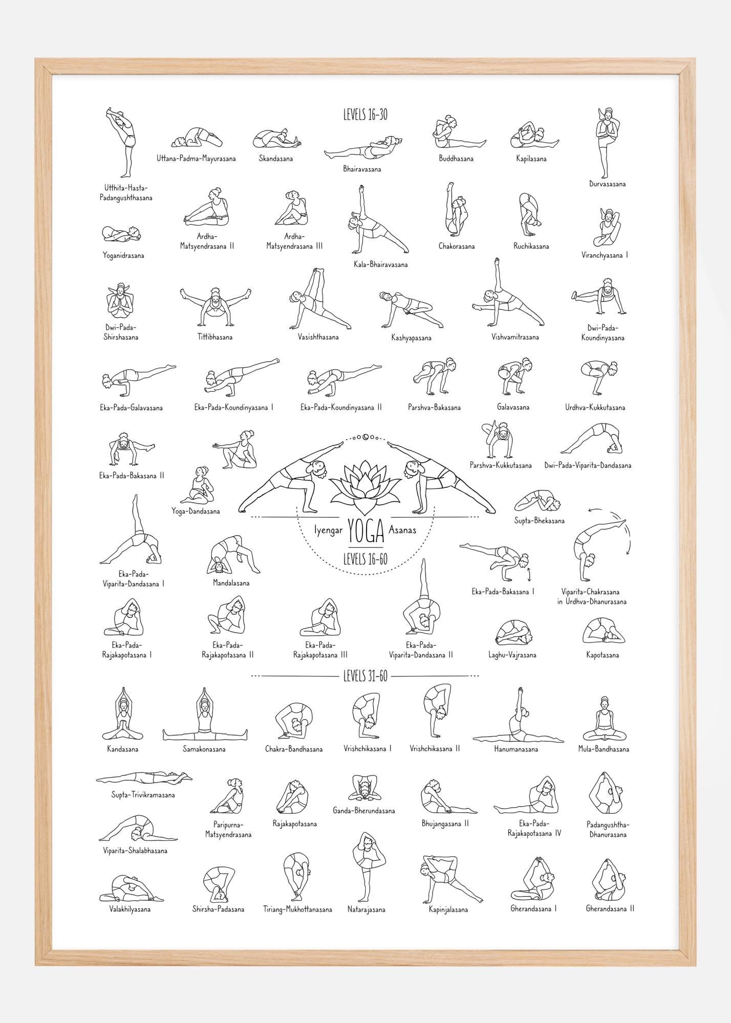 Tämä kattava ja yksityiskohtainen juliste esittää monipuolisen valikoiman jooga-asanoita, jotka on sovitettu keskitasoisille ja edistyneille harjoittelijoille. Jokainen asento on huolellisesti piirretty yksinkertaisella linjataiteella, mikä tekee katsojalle jokaisen asennon muodon ja suunnan ymmärtämisen helpoksi. Asanat on järjestetty asteittain vaikeustason mukaan, tasoilta 16–30, ja jokainen asento on selkeästi merkitty perinteisellä sanskritin kielellä.