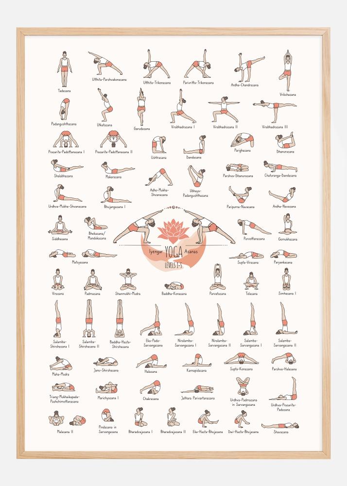 Tämä värikäs ja inspiroiva juliste esittelee laajan valikoiman Iyengar Yoga Asanoita tasoilta 1-5, esitettynä eloisalla ja mukaansatempaavalla suunnittelulla. Jokainen asana on selkeästi kuvattu yksityiskohtaisella ja värillisellä kuvituksella, joka korostaa sen muotoa ja tarjoaa välittömän visuaalisen ymmärryksen jokaisesta asennosta. Asentojen nimet on merkitty jokaisen kuvituksen viereen sanskritiksi, mikä tekee julisteesta arvokkaan ja pedagogisen resurssin.