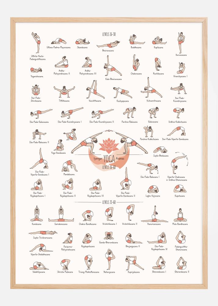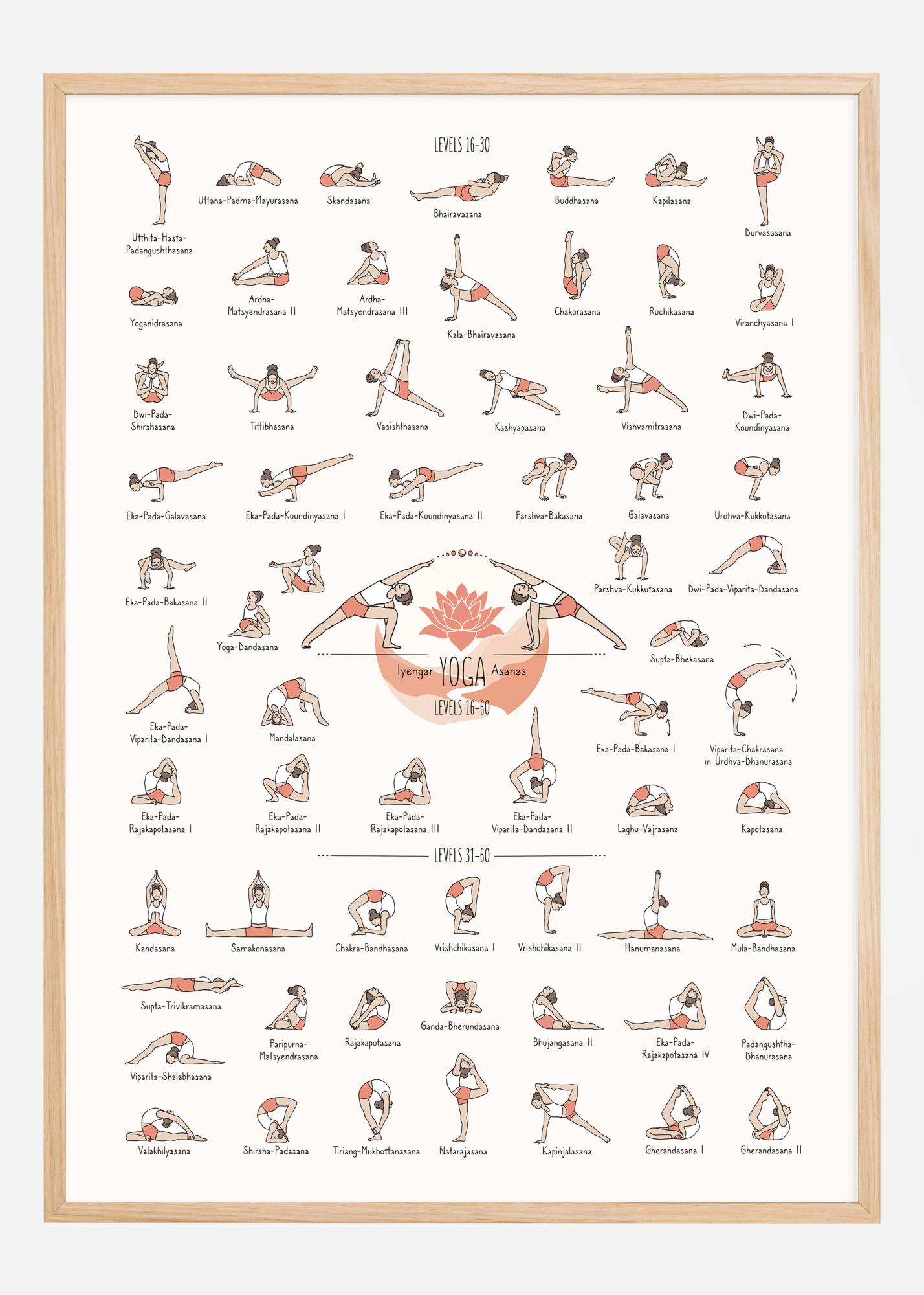 Tämä värikäs ja opettavainen juliste on opas Iyengar Joogaan, suunnattu keskitason ja edistyneille harjoittelijoille, tasoille 16–30. Asanat on kuvattu maanläheisellä väripaletilla, joka korostaa kunkin asennon ainutlaatuista muotoa ja rakennetta. Harjoitukset on huolellisesti numeroitu ja nimetty sanskritiksi vastaamaan laajaa yleisöä.