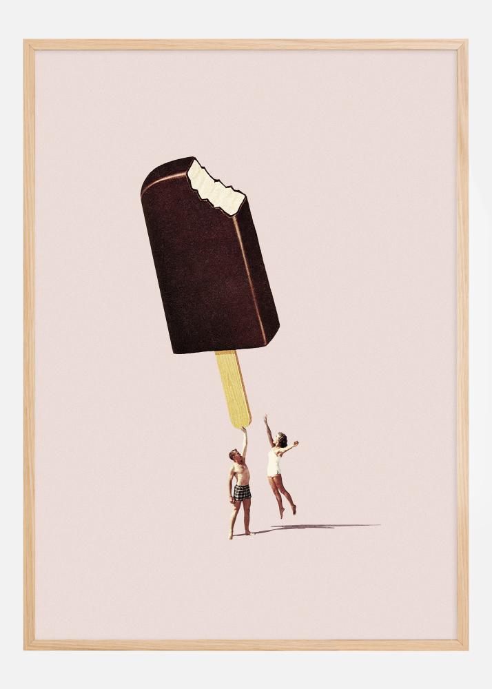 Tämä viehättävä juliste esittää ainutlaatuisen ja leikkisän kuvan kahdesta henkilöstä, jotka näyttävät löytäneen jättimäisen jäätelöpuikon! Kuvan mielikuvituksellinen sommittelu ja lämmin vaaleanpunainen tausta tarjoavat tunteen kesäisestä ilosta ja nostalgiasta. Iloiset hahmot, pukeutuneina yksinkertaisiin uimapukuihin, ojentavat kätensä jäätelöpuikkoa kohti, joka näyttää realistiselta puraisujälkineen, luoden ihastuttavan kontrastin minimalistiseen ympäristöön. Tämä luova ja eläväinen kohtaus vangitsee katsojan huomion ja herättää muistoja aurinkoisista päivistä.